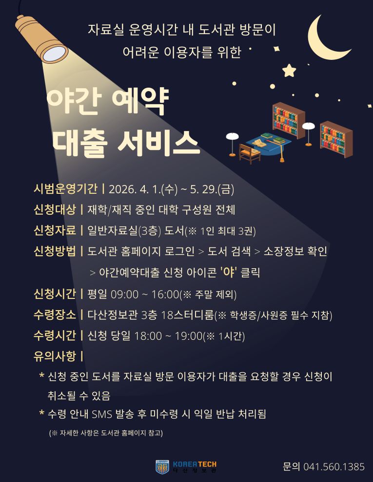 자료실 운영시간 내 도서관 방문이 어려운 이용자들의 편의를 위해 야간예약대출서비스를 시범 운영합니다.