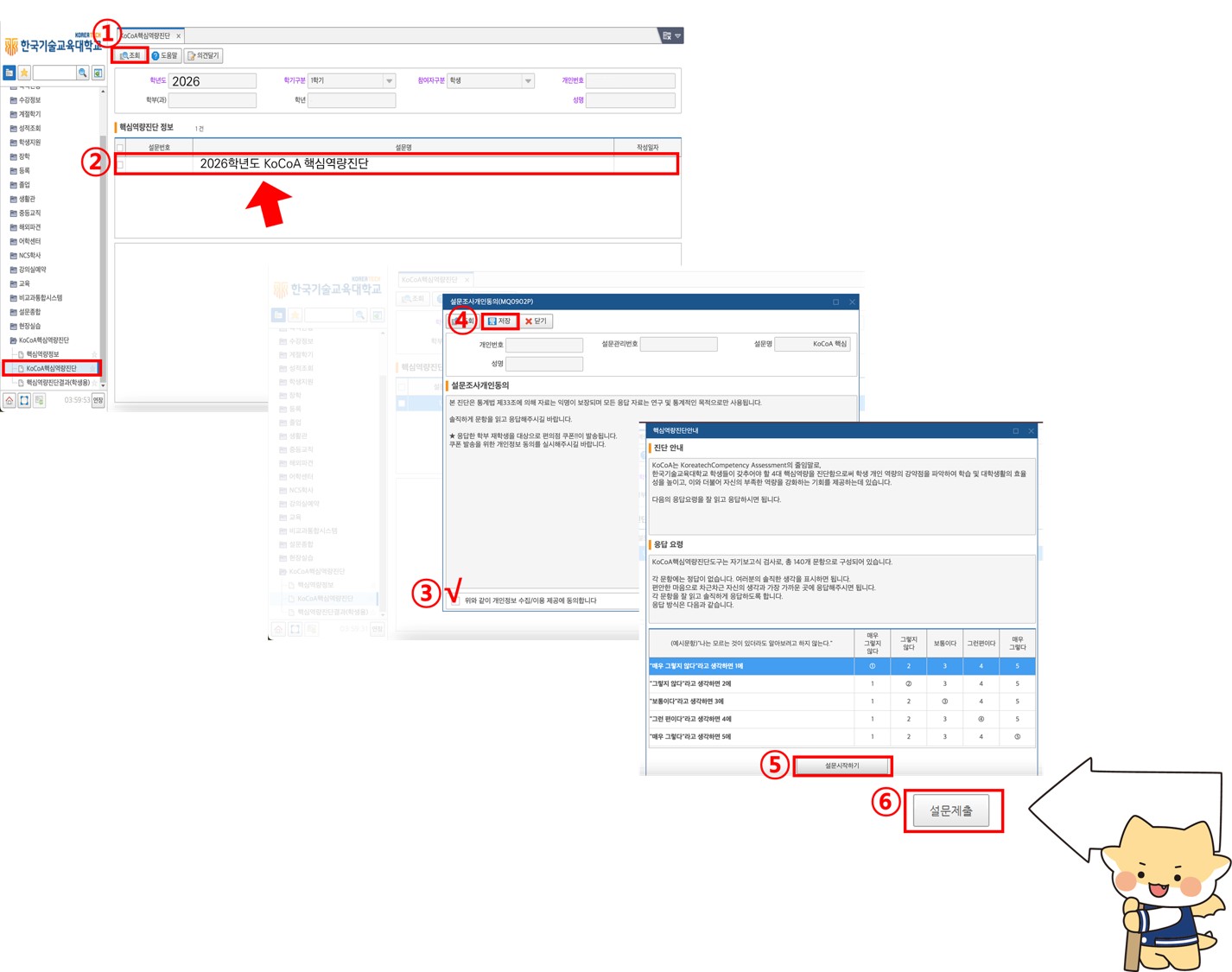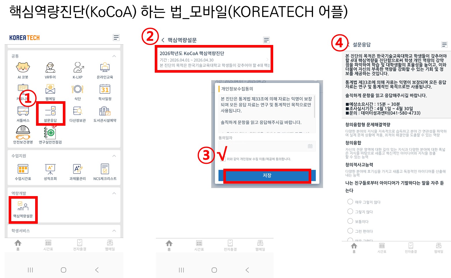 ③ KOREATECH 어플 접속 - 공통:설문응답 OR 역량개발-핵심역량설문 - 진단명 클릭 - 실시